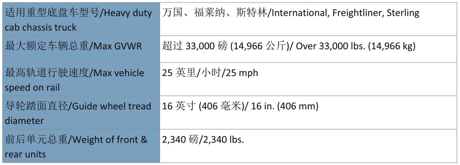 哈斯科鐵路公司生產(chǎn)的4141重型公鐵兩用車適用于滿足哈斯科鐵路公司推薦規(guī)格的重型卡車和底 盤車,使其可在公路和鐵路上行駛。4141重型公鐵兩用車設(shè)計堅固緊湊,可提供軌道作業(yè)所需的 持久性。它采用了液壓鎖、鋼軌電子絕緣和機械式安全銷。